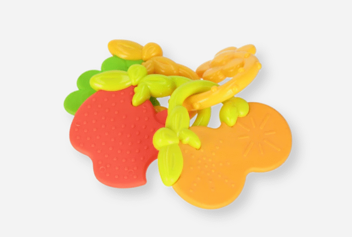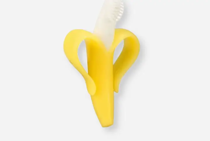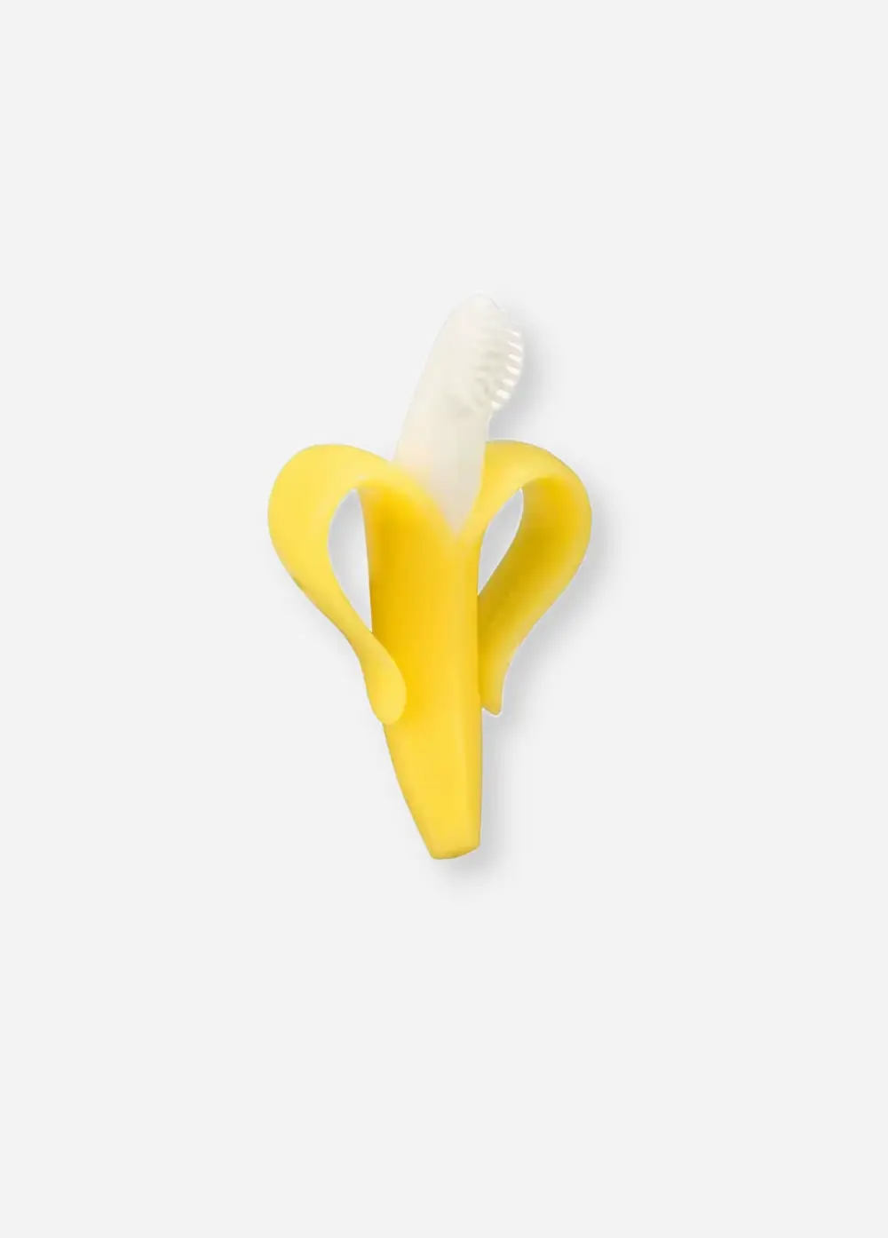 Een silicone bijtring in de vorm van een banaan. Ook kan je baby zijn tandjes ermee poetsen.